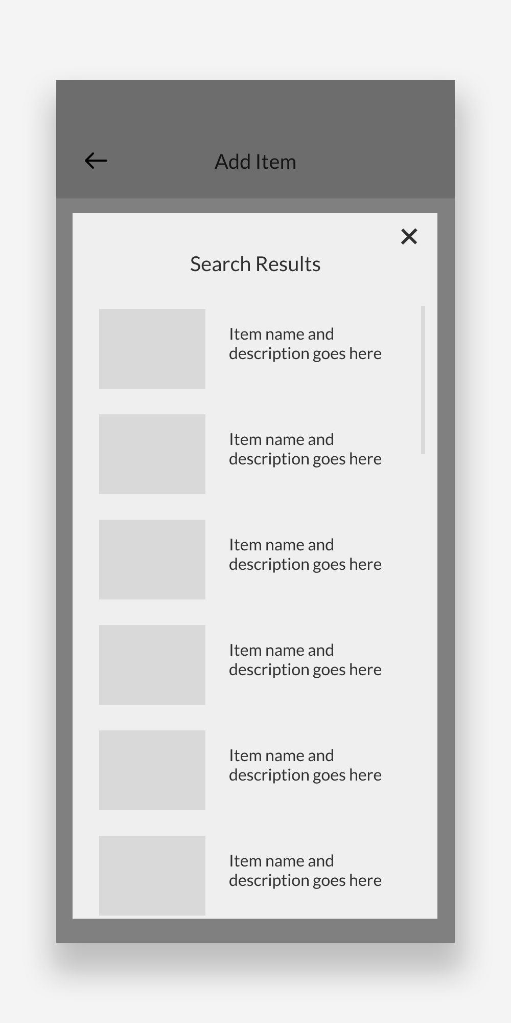 Search results overlay appears on top of the “add item” screen