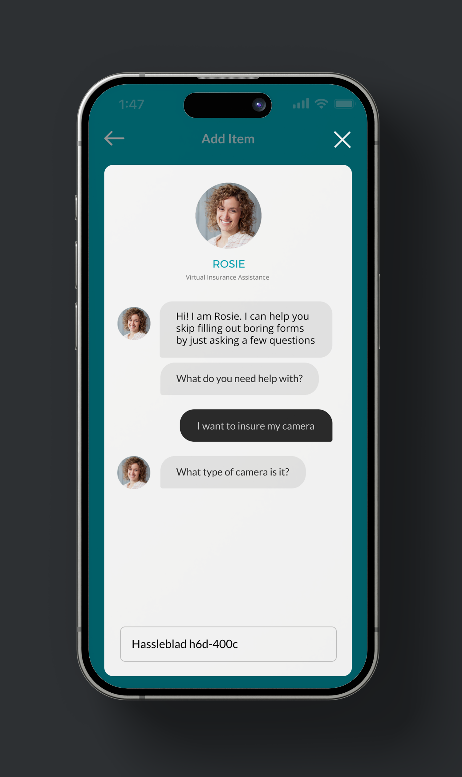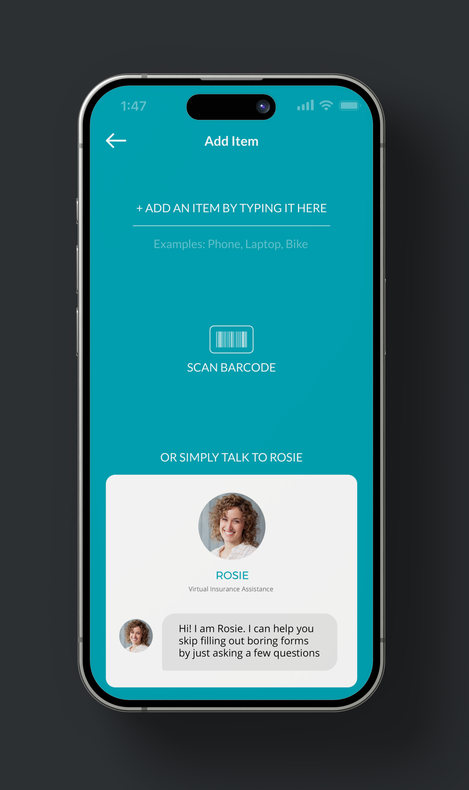 This application consists of 4 main sections: My Items, Add Item, ROSIE and Main Menu. ROSIE bot is present in almost all of the sections as it encourages users to engage with this application in a conversational manner, skipping forms and multiple steps associated with managing insurance policy and coverage.
