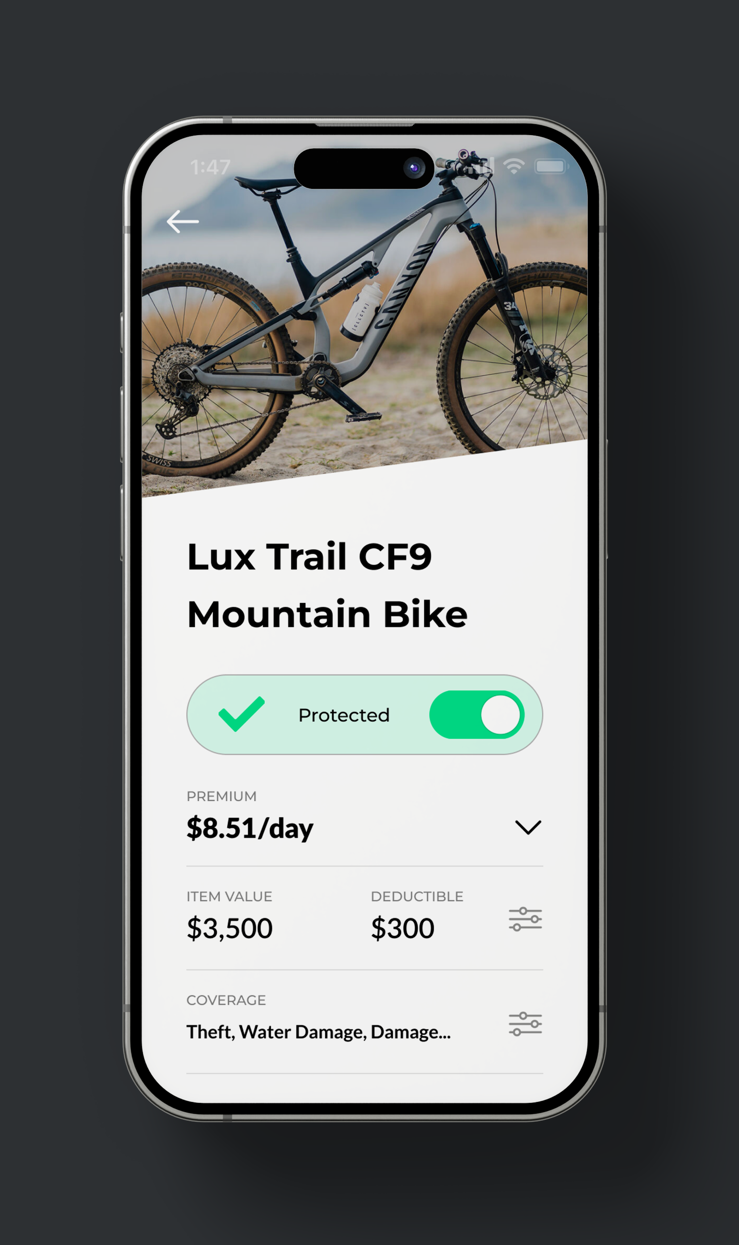 This page displays all the available policy details and includes a clear CTA for starting/pausing the coverage. User can adjust coverage categories, deductible amount and payment frequency.