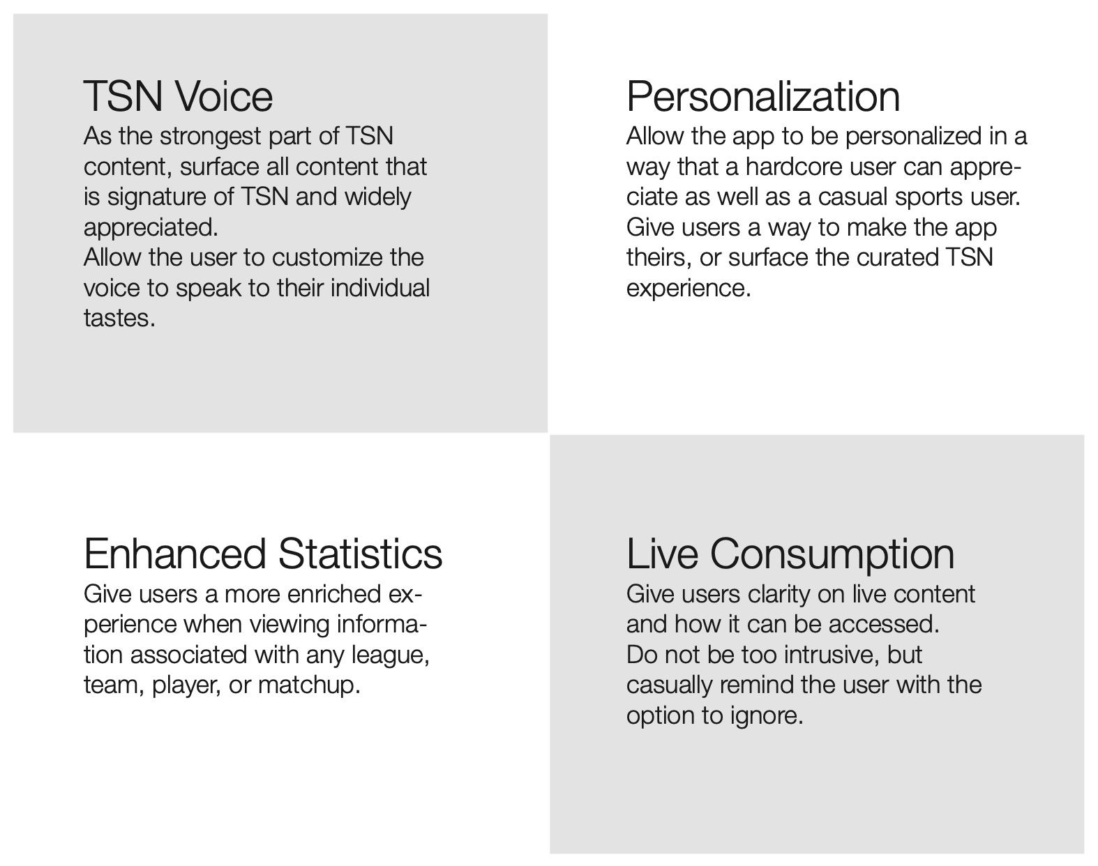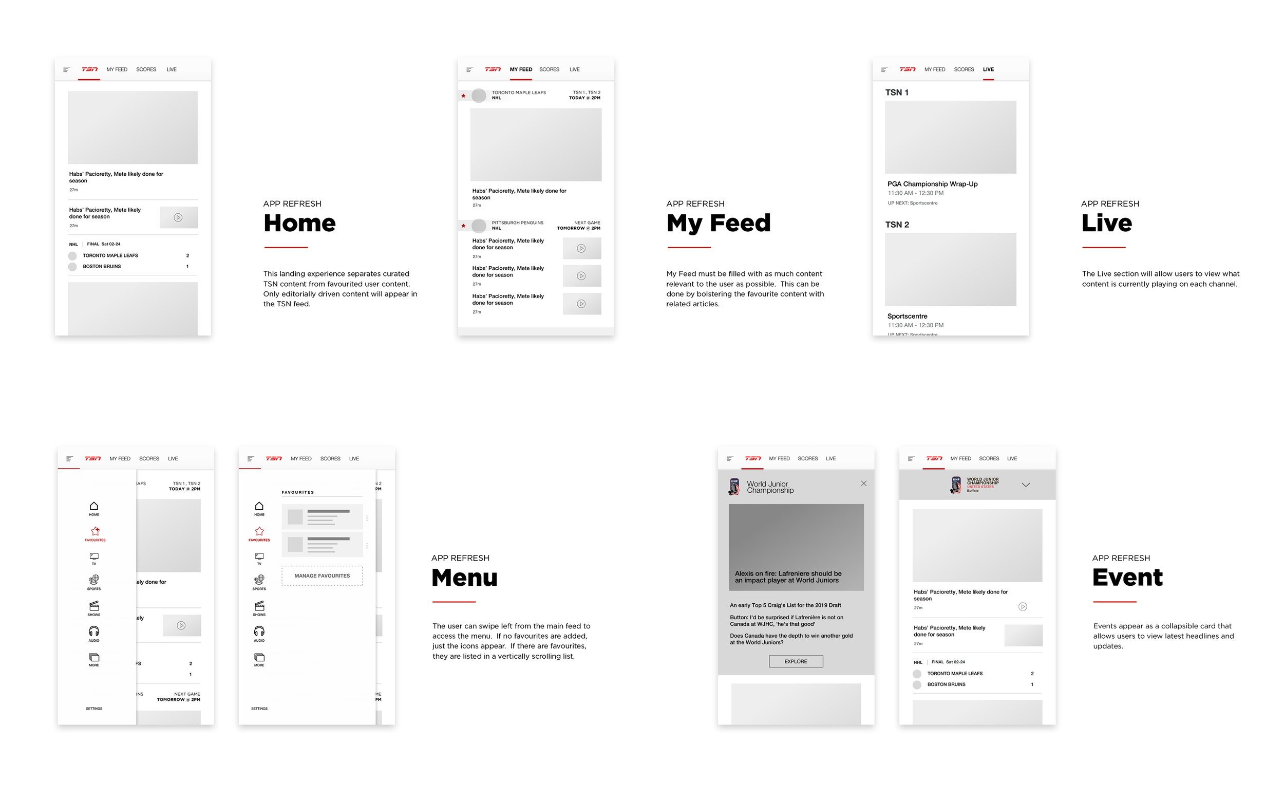 The visual design direction was re-imagined into a clean white look that would contrast greatly from the previously heavy design. The white would help make the TSN branding colour stand out more and make the thumbnails stand out against the clean background.