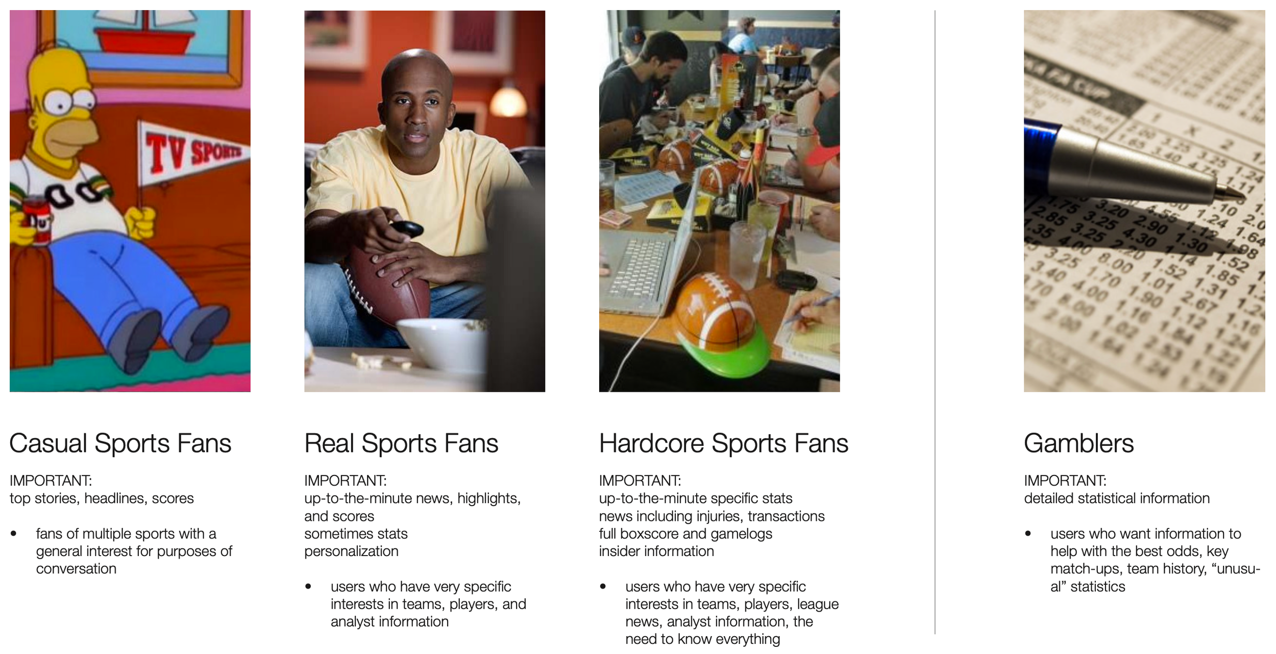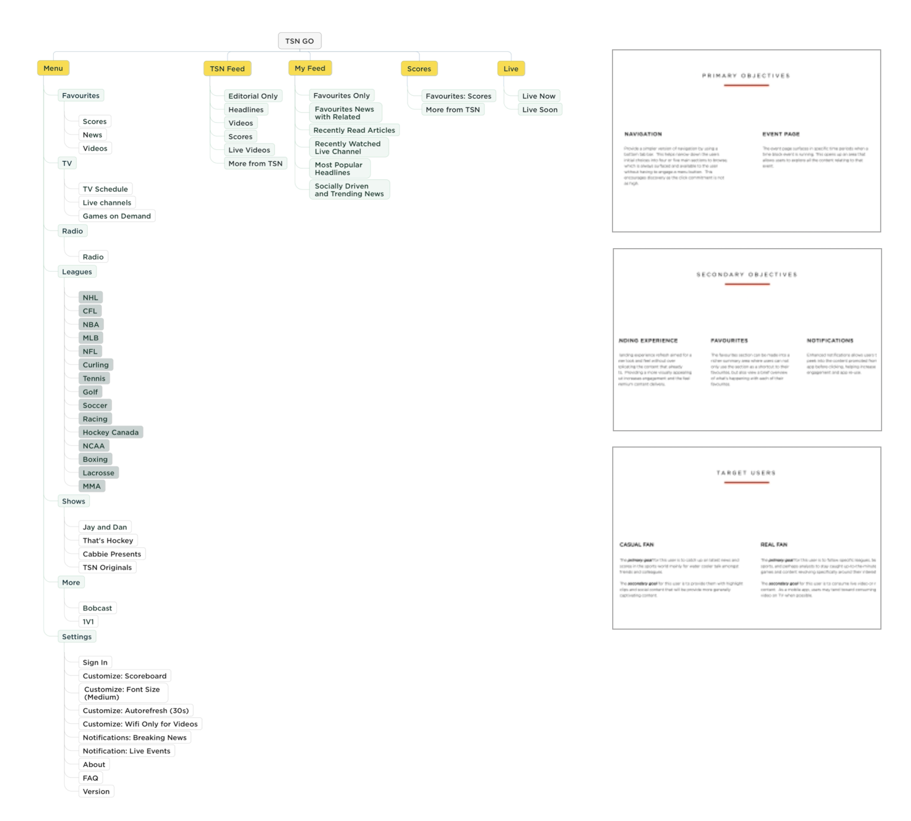 The client narrowed down two primary objectives from the discovery process. They wanted to focus mainly on updating the navigation to something much more clean, modern, and intuitive. The other primary objective would be for the event section. As the World Cup was coming up, the client wanted to be able to add in the event section to the existing app first, then incorporate it into the updated app later. Secondary objectives to keep in mind were key targets that the client highlighted as problem areas. The array of personas was also cut down to focus on two main ones that they saw as most relevant for their app: the casual fan and the real fan.