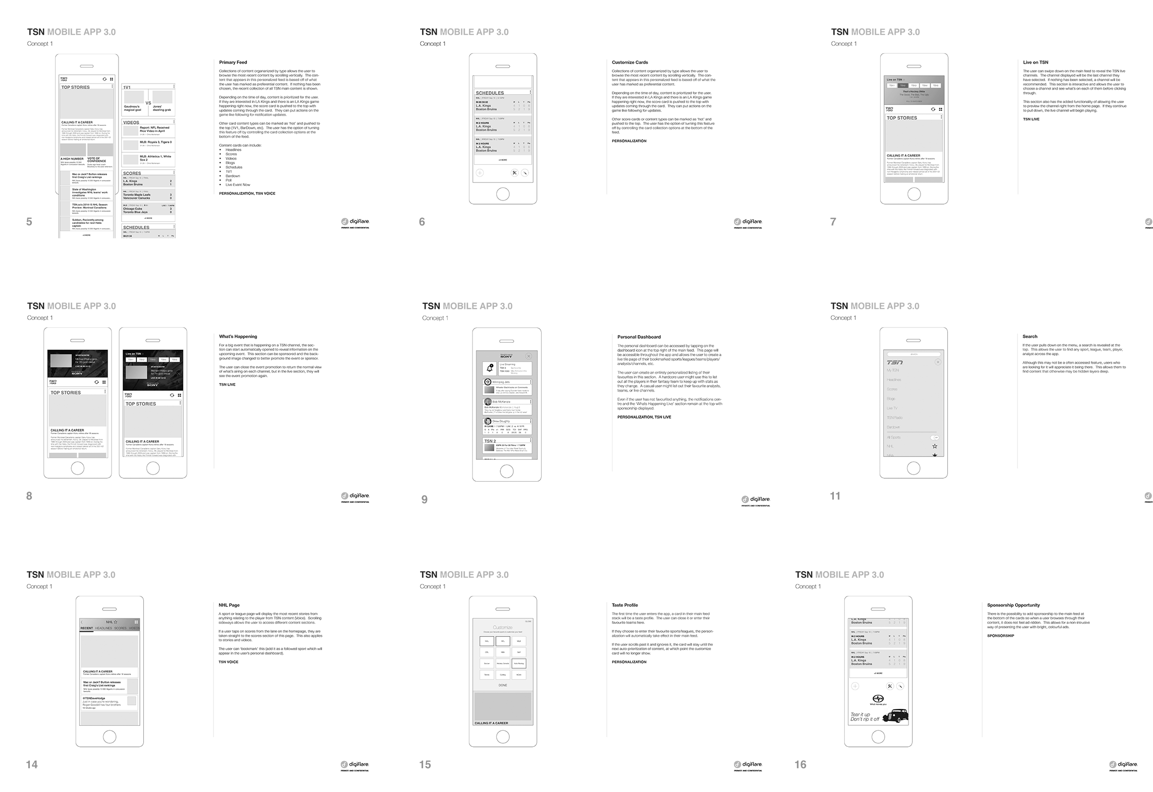 The second concept had the idea of a floating, customizable menu. This menu would allow users to favourite teams, leagues, analysts, players, etc., essentially building their own app. The menu would begin with a core set of immovable items (headlines, scores, videos, live), but the user can choose to rearrange or add to them. This was one of the existing issues highlighted by the client team. They felt that users did not immediately recognize that the menu was part of the logo, and that it was too heavy and cumbersome.
